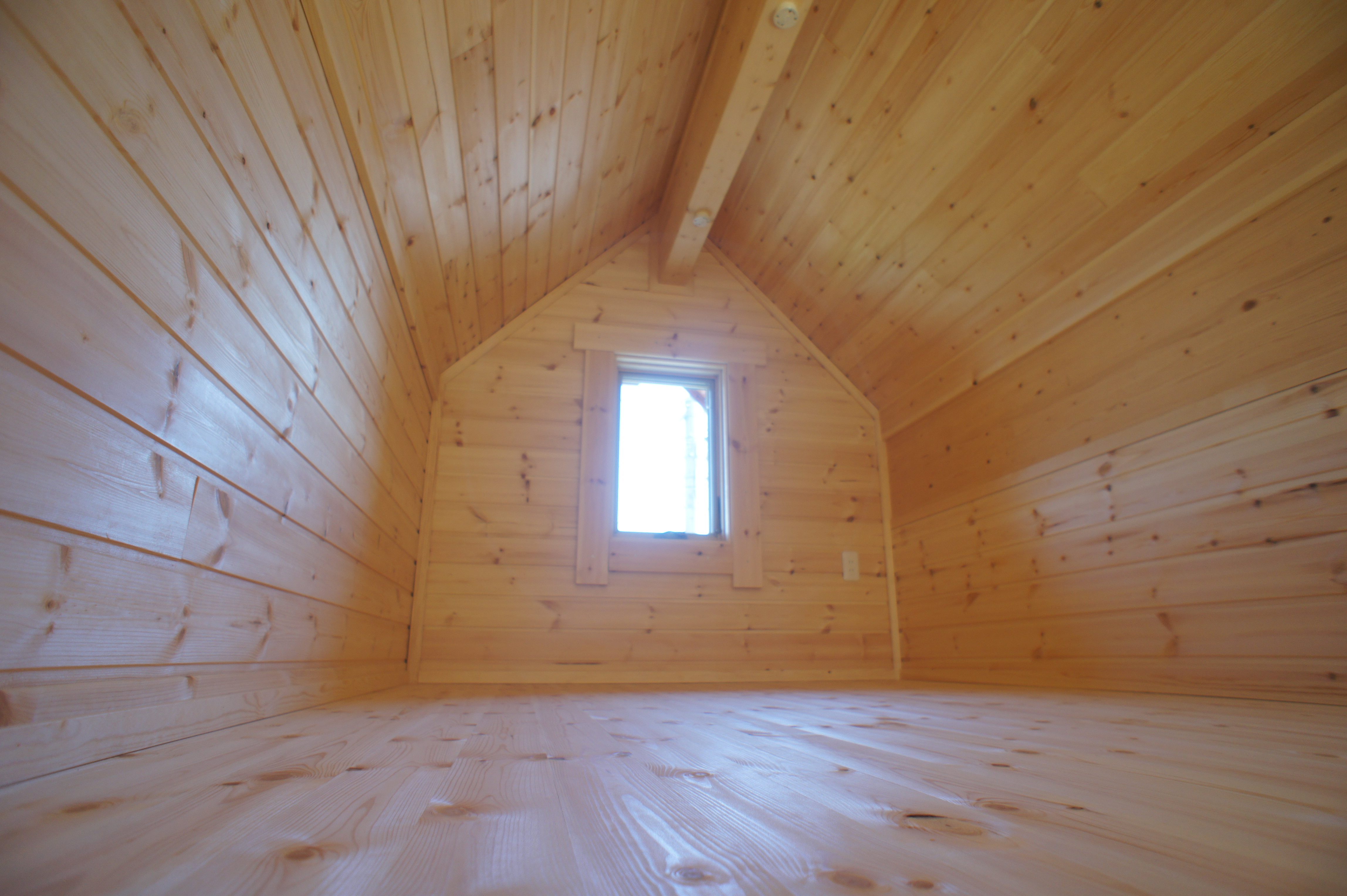 三角形の屋根に、丸太の外壁が特徴。